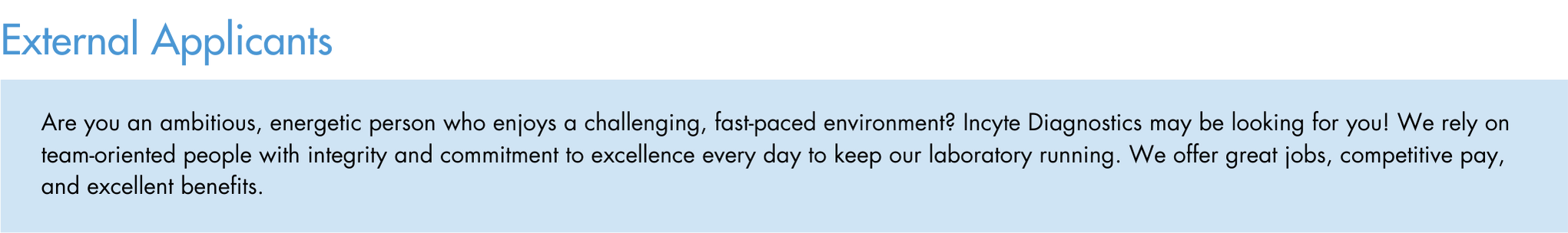 Incyte Diagnostics is an equal opportunity employer. Qualified applicants will receive consideration for employment without regard to race, color, religion, sex, sexual orientation, gender identity, national origin, disability or protected veteran status.